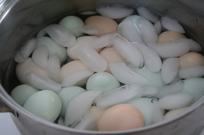 4. When the eggs have finished cooking, remove them from the heat and drain out the water. Then immediately submerse your eggs in an ice water bath.