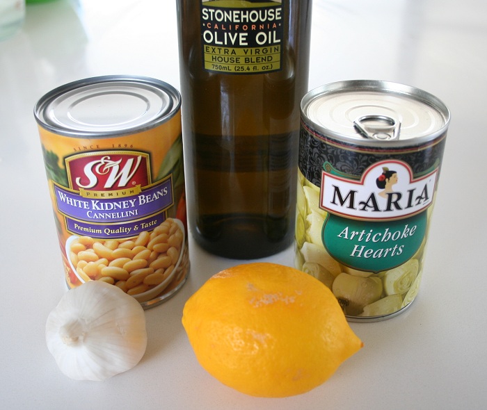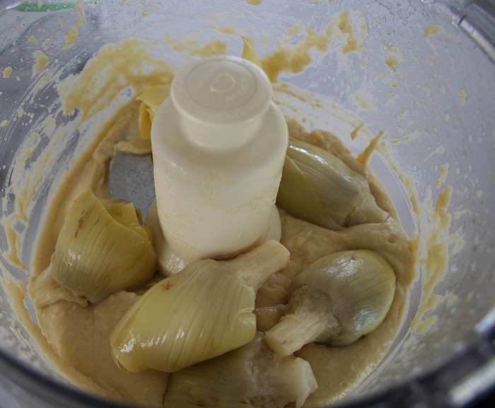 2. When the bean mixture is completely smooth, add the drained artichoke hears and pulse the processor 3-4 times so that the artichoke hearts are still chunky.