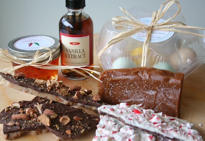 Here is a picture of what I made this year to give out. I will try to link the blog post on how we made the items. We made Homemade Vanilla Extract, Fleur de Sel Caramels, Pepper Jelly, Almond Roca and Peppermint Bark. Our hens were quite generous and donated some beautiful eggs.