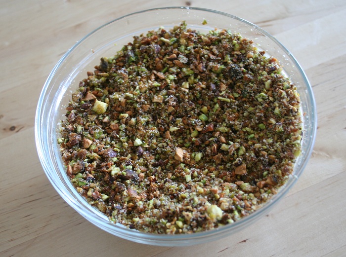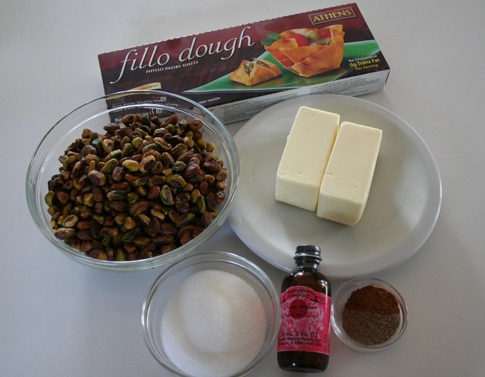 - Put the pistachios, sugar, cinnamon, and cardamom in a food processor and process until the nuts are finely chopped about 15 to 20 seconds. Set aside.