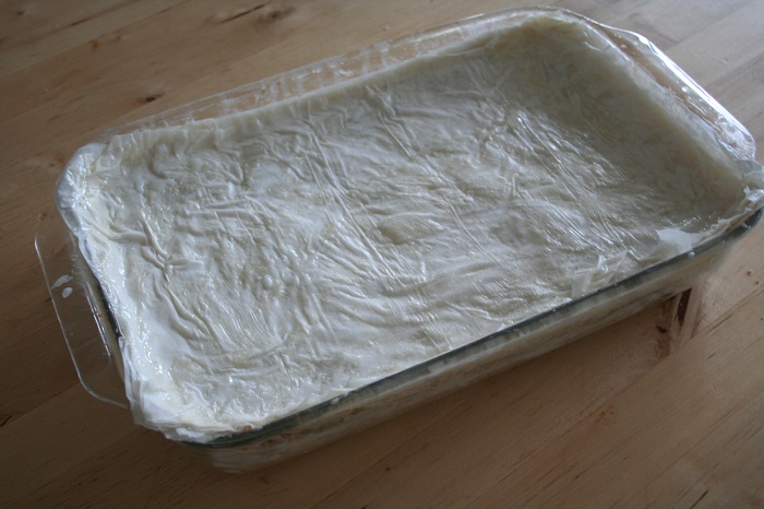 - Melt the butter in a small saucepan or microwave. Brush the bottom of a 9×13-inch pan. Remove one sheet of phylo and place evenly on the bottom of the pan. Quickly brush layer with melted butter, then place another sheet on top and brush with butter again. Repeat until you have 10 layers down brushing between each layer with melted butter. Do not go overboard with the butter. You will have 40 layers of phylo.