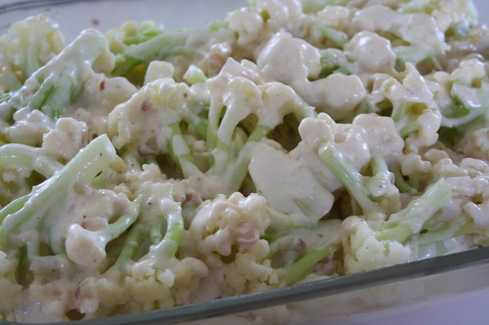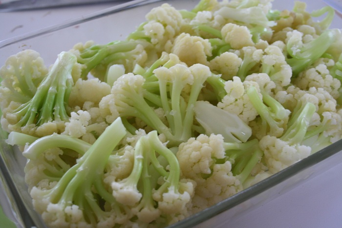 In an 8 by 11 by 2-inch baking dish, place the drained cauliflower on top and then pour the sauce evenly on top.