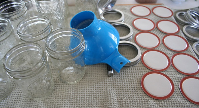 1. Bring a big pot of water to boil and sterilize jars, rings and lid. I do this by washing lightly with soapy water, rinsing, then boiling for 15 mins. I do not boil the lids. I add this at the last minute so the gummy part of the lid does not fail. I also sterilize my jamming equipment as well and lay it out on a clean kitchen towel.